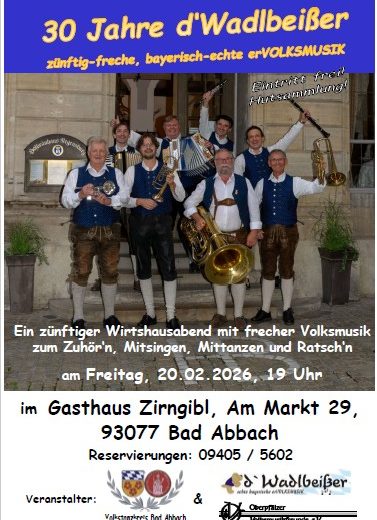 Die Veranstaltung findet am Freitag, 20.02.2026, Gasthaus Zirngibl, Am Markt 29, 93077 Bad Abbach statt. Der Eintritt zur Veranstaltung ist frei. Die Musikanten freuen sich über jede Spende. Reservierungen sind unter Tel.Nr.: 09405 / 5602 möglich.